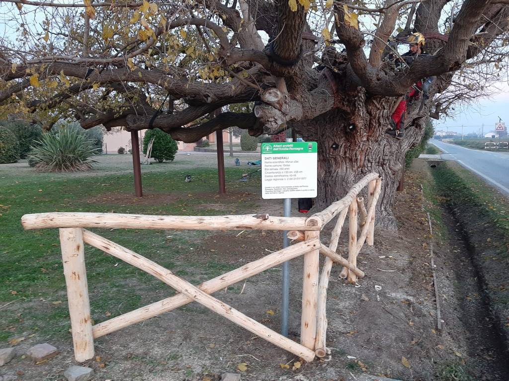 Il Gelso si presentava con diversi problemi strutturali, perciò siamo dovuti arrivare ad un compromesso per cercare di non perdere l’intero esemplare. Sono stati installati consolidamenti in chioma ma anche sul fusto e, successivamente dei puntelli definitivi per sorreggere le lunghissime branche.