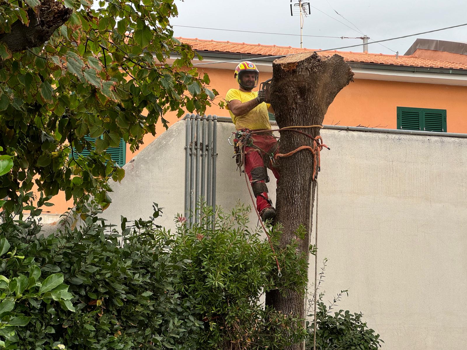 L’abbattimento controllato in tree-climbing è una tecnica di lavoro che viene utilizzata qualora non sia possibile l’abbattimento dell’intero albero, ad esempio quando lo spazio libero a disposizione non è sufficiente. Con l’ausilio di particolari attrezzature, funi, carrucole, dissipatori si può smontare la pianta a pezzi calando le parti a terra controllandone la discesa.
